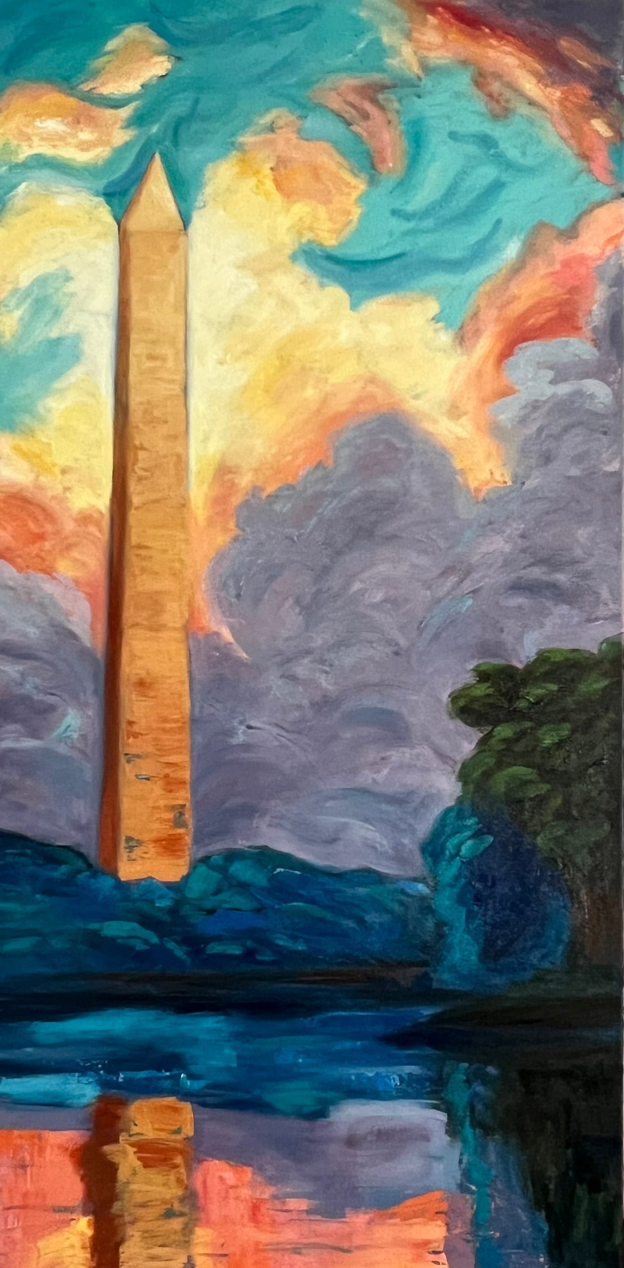 "Genesis" is an expressive painting with lots of impasto texture of the Washington Monument. Stormy clouds give way to a bright beginning of sunshine in the Capital city. Size: 18x36 Oil on Canvas.
